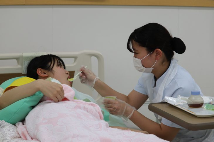 1年生は基礎教養授業と看護演習。移乗や移動、食事介助など看護技術を習得しています。