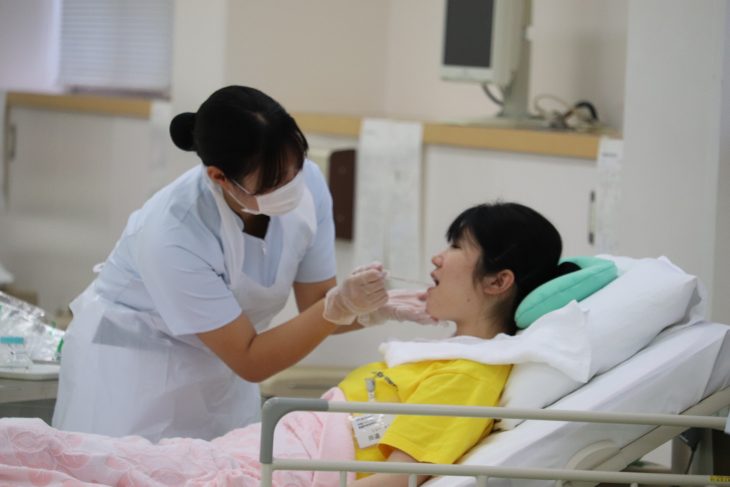 本日の演習は、「経管栄養カテーテル挿入と固定」「栄養剤の注入・滴下数調整」「栄養剤の試飲」をおこないました。