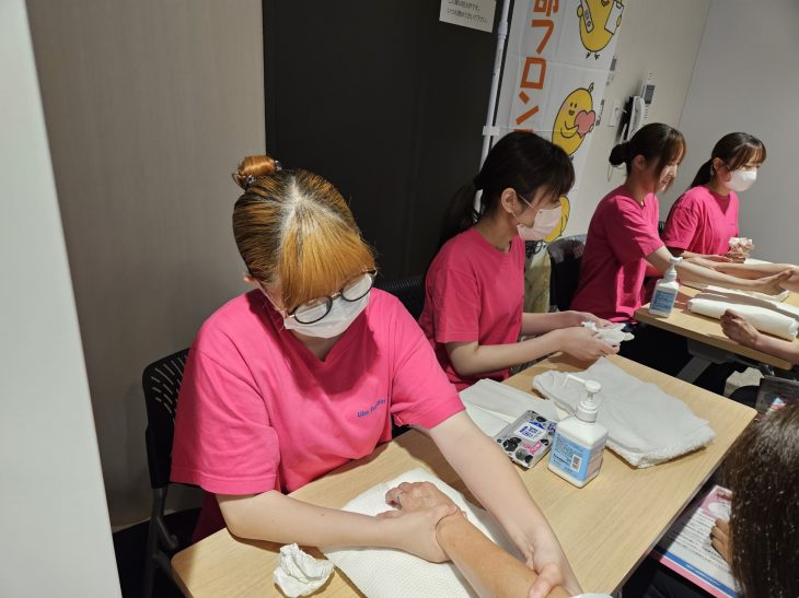 看護学部では、学生ボランティアとしてハンドマッサージを行っています。