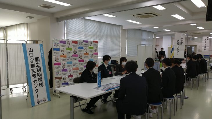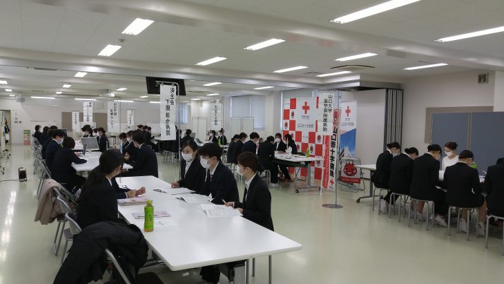 (写真)大学で開催された合同就職説明会(3年生対象)の様子です。山口県内の複数の病院施設の方々にご来場いただき、ご説明を頂きました。
